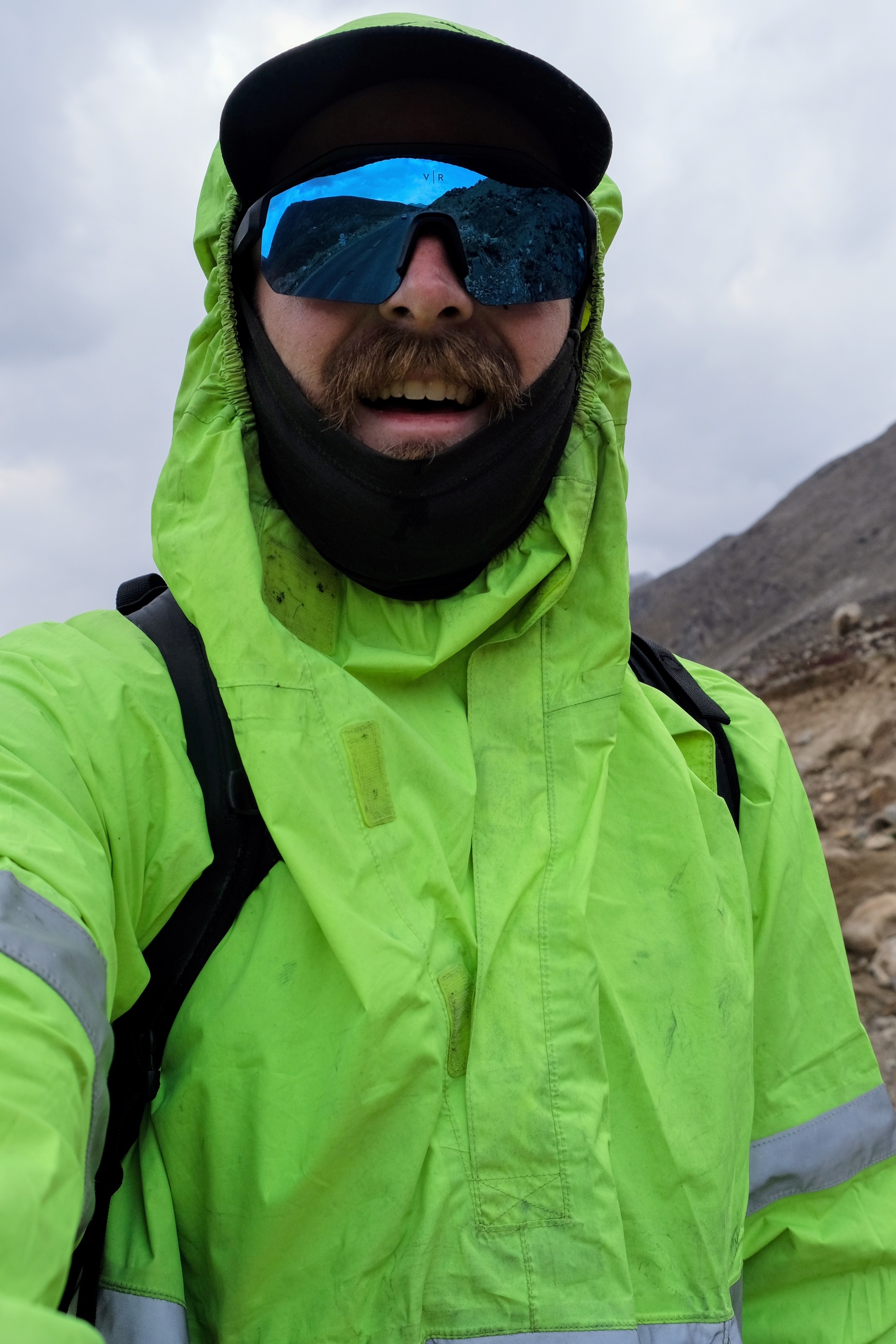 From my camp I set off carrying little more than water, crisps, and biscuits, assuming roadside stalls would appear along the way. They didn't. The green valley faded, surrendering itself to gray, windblasted rock and scree. The first half was manageable, but the final ten kilometres were the hardest of my life. I would push the bike ten metres, stop, lean on the handlebars, lungs clawing for oxygen. My limbs were heavy, my kidneys throbbed, and every step screamed at me to collapse and sleep. Cars slowed as they passed - some to wave, some to film, unaware the state I was in, beneath so many layers of clothing and a covered face. One family handed me water and almonds, which I crab-clawed into my mouth like a starving animal. Another car, already packed with five people in the back, insisted on helping. They lifted the front of my cargo bike into the back of the car, with two people each pulling metal poles of my front cargo bike bed, the rear wheel bouncing over scree that had fallen in the road, as we sped the last kilometres to the top of the pass. The last brutal kilometer disappeared in a minute, and I profusely thanked the family as I waved goodbye with my still frozen claw hands.