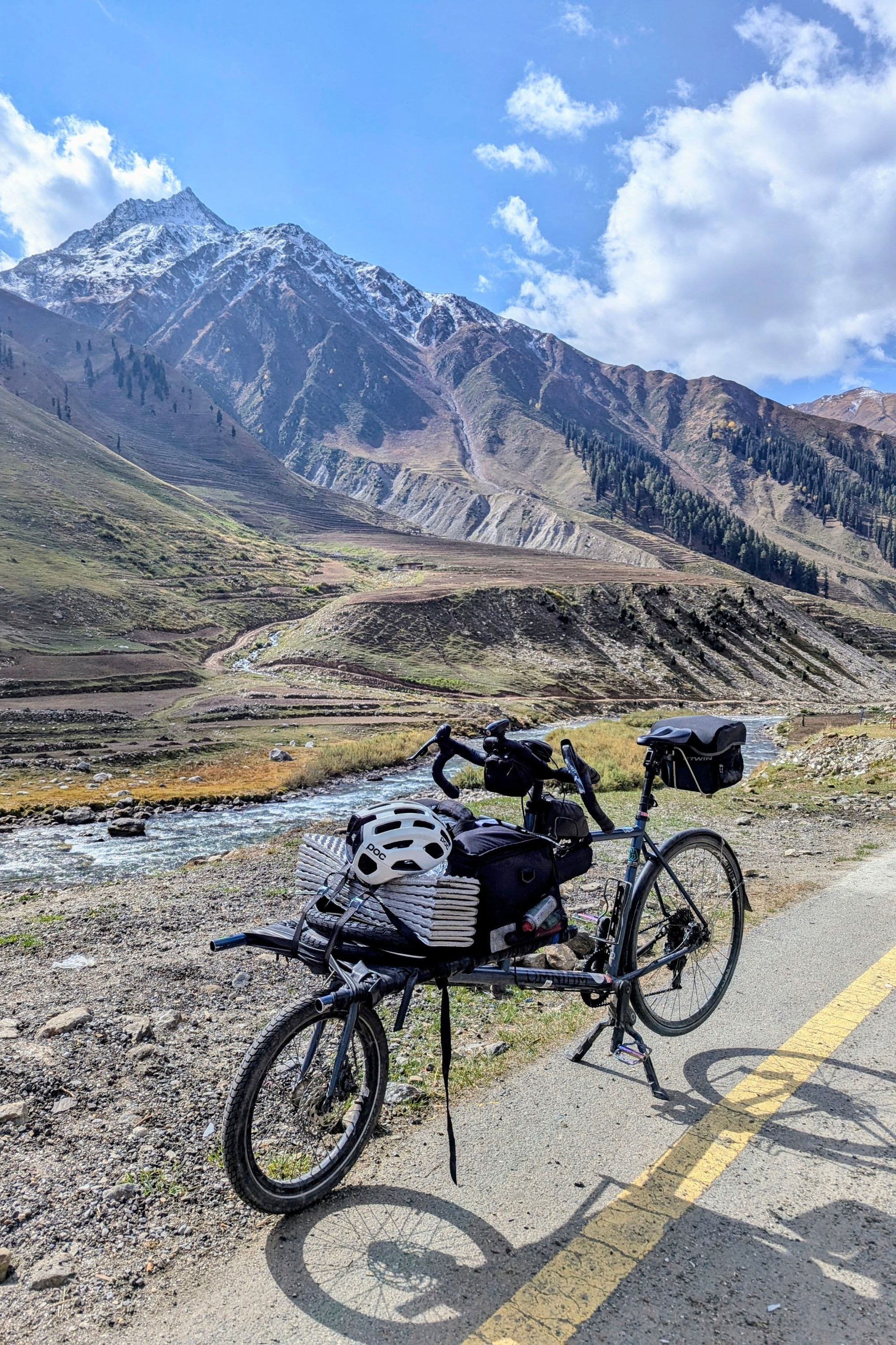 The landscapes shifted again, barren, rocky slopes gave way to alpine meadows, icy streams trickled from melting snow, and cliffs dropped sharply into river valleys below. Dust coated my chain and cassette, slowing me so much that pushing the bike was sometimes faster than riding.